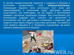 Выделяют и негативные стили общения. К ним можно отнести: а) общение-устрашение, которое строится на жесткой регламентации деятельности, на беспрекословном подчинении, страхе, диктате, ориентации детей на то, чего делать нельзя; при этом стиле не может быть совместной увлеченности деятельностью, не может быть сотворчества; б) общение-заигрывание, основанное на желании нравиться воспитанникам, завоевать авторитет (но он будет дешевым, ложным); молодые педагоги избирают этот стиль общения в силу отсутствия опыта профессиональной деятельности, опыта коммуникативной культуры; в) общение-превосходство характеризуется желанием педагога возвыситься над воспитанниками; он поглощен собой, он не чувствует учащихся, мало интересуется своими отношениями с ними, отстранен от детей.