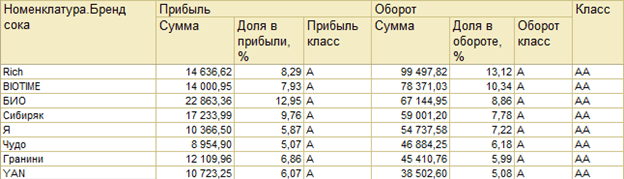 Определяющим будет то свойство или несколько свойств, которые сильнее всего влияют на продажи, и, тем самым, явно отражают товары-лидеры и товары-аутсайдеры в отчетах. Так, например, на рис. 3 видно, что свойство "бренд" не является ключевым для категории "соки" и не образуют четкую ABC-классификацию. Свойство "вкус", наоборот, отражает явных лидеров: соки "ягодные" и соки со вкусом "яблоко".